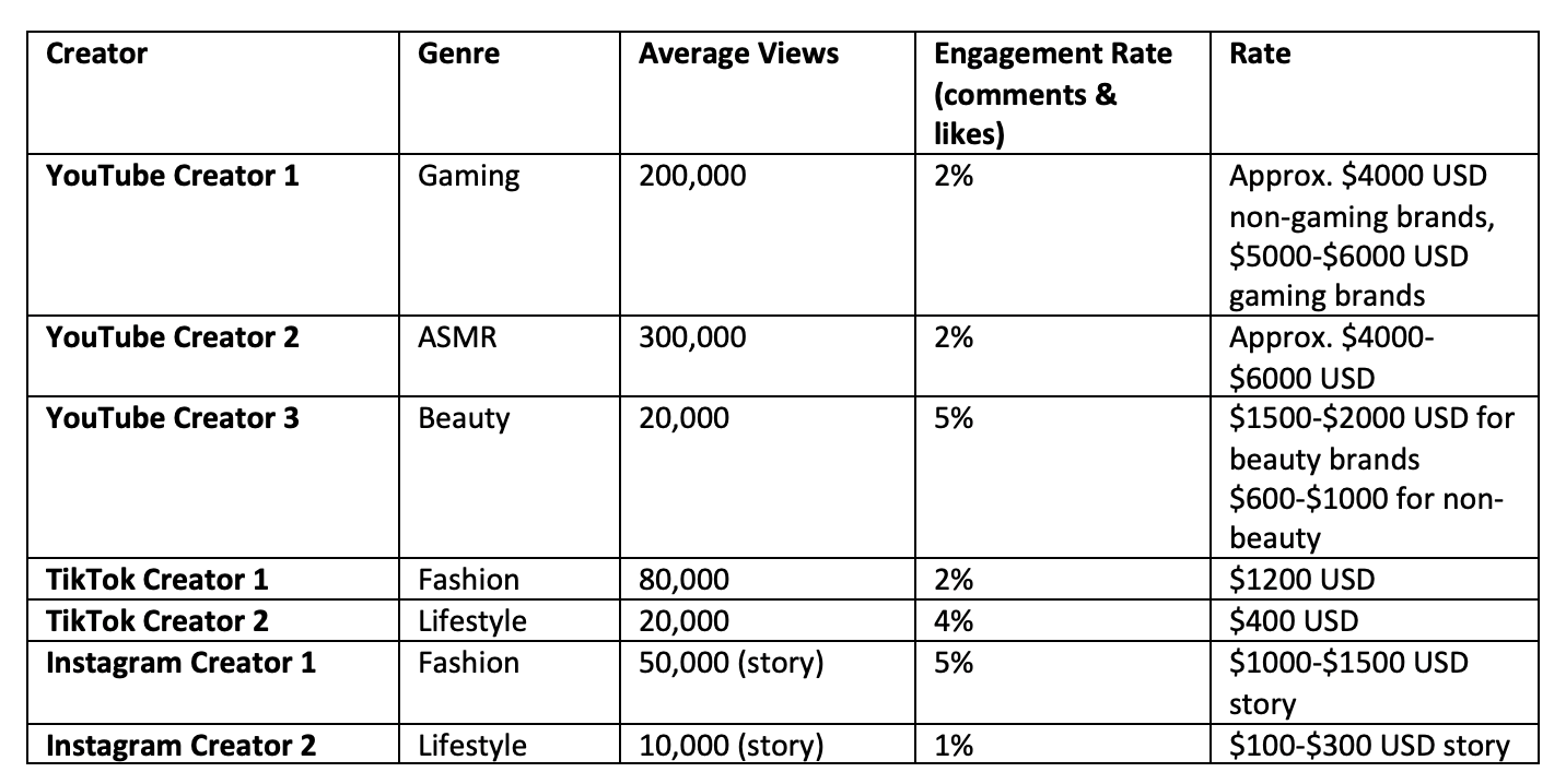 To help you work out what your ‘perfect’ rate is, see the below table, using example creators across YouTube, Instagram and TikTok. Remember, calculate your CPM using the average $20 CPM rate and then adjust according to the genre your content is in and your engagement rate.